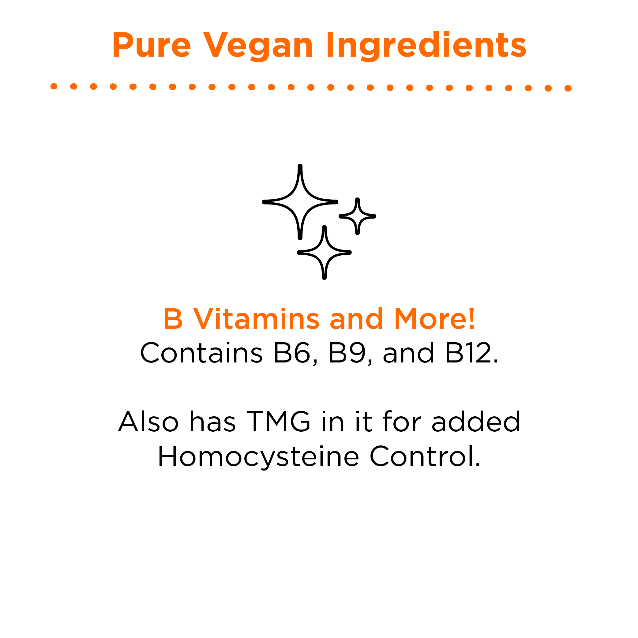 - Works in 3 ways. B9 + B12 Remethylation, B6 Trans-sulfuration, and TMG Remethylation to help manage homocysteine levels.