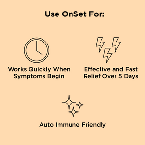 We all have places to be and people we love to be with. There are immense feelings of disappointment when sickness hits us and we have to worry about keeping those around us safe. Our OnSet, natural immunity booster combines 18 botanicals, vitamins, and minerals which may give your body the boost it needs. Take when symptoms first start and continue for just 5 days. Onset may help boost your immune system to get you back to feeling well and productive.