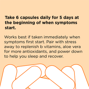 - Works best if taken immediately when symptoms first start. Pair with stress away to replenish b vitamins, aloe vera for more antioxidants, and power down to help you sleep and recover.
