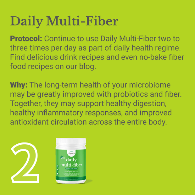 The Protocol: Take 1 serving of daily multi-fiber in the morning, 1 in the afternoon, and 1 in the evening. Repeat for 30 days. Mix with water, smoothies, no-bake snacks, yogurt, or oatmeal.