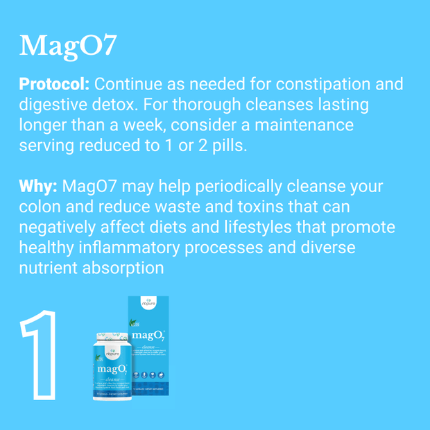 • Why: MagO7 is first in the protocol because it helps rid the digestive system of waste and toxins that may interrupt gut homeostasis and reduce the efficacy of the rest of the protocol.