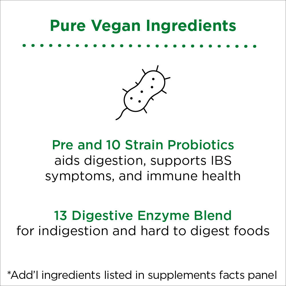 - 13-enzyme blend + 10-strain probiotic. All-in-one small & large intestinal support.