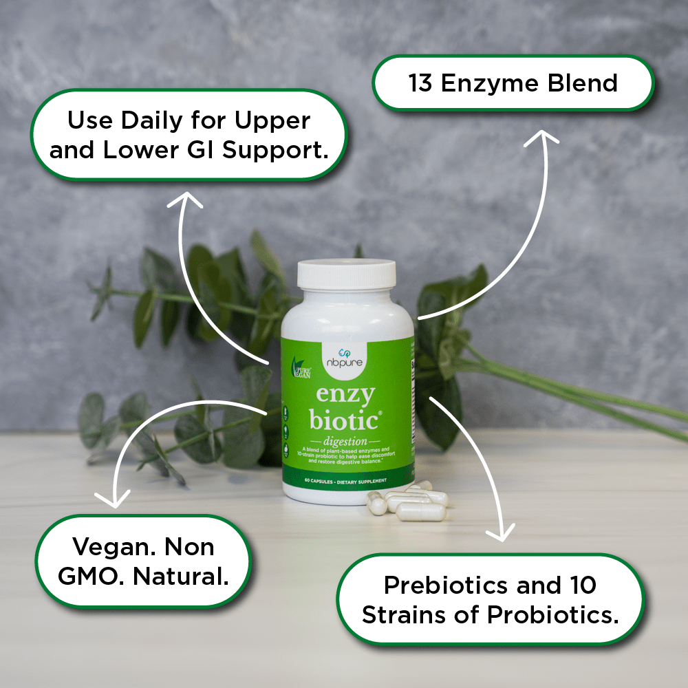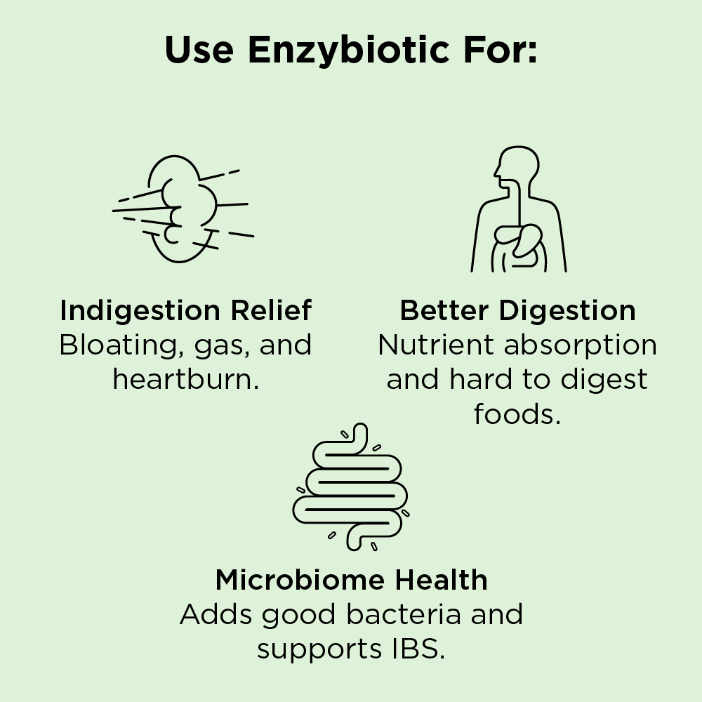 Many digestive issues start in the small intestine and end 25 feet later in the large intestine. Taken before meals, Enzybiotic releases a powerful blend of 13 digestive enzymes that may aid the small intestine in breaking down fats, carbohydrates, proteins, and hard to digest foods. The 10-strain probiotic blend, fueled by added prebiotics, may further aid digestion via fermentation and may support immune system, intestinal lining, and healthy inflammatory responses.
