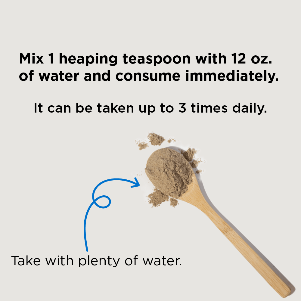 - Vigorously mix 1 heaping teaspoon in 12 oz of water or juice and consume quickly